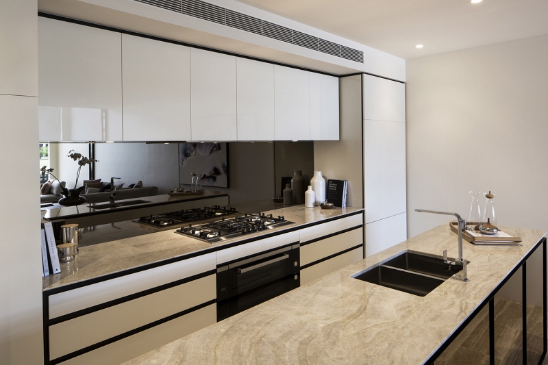 Stone Kitchen Bench Tops, High Gloss Cabinetry and Integrated Fridge