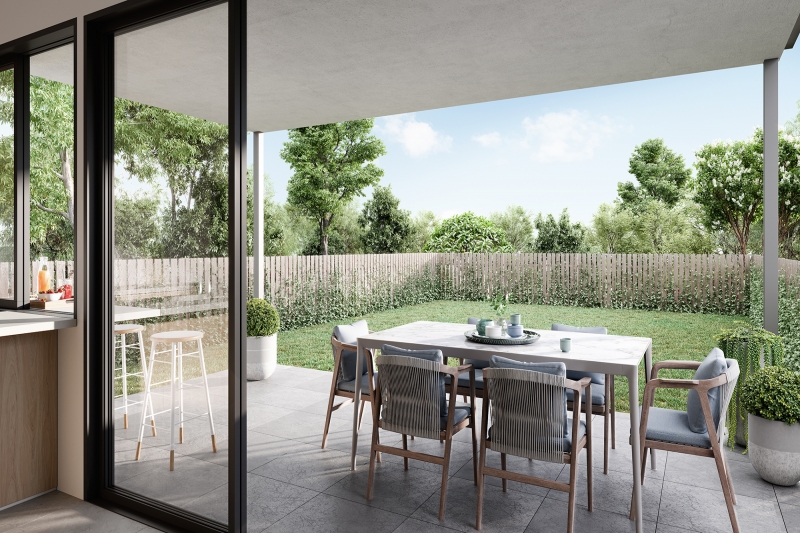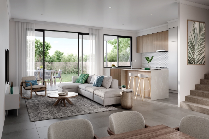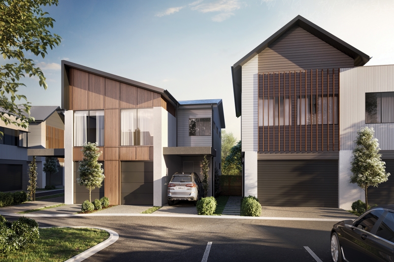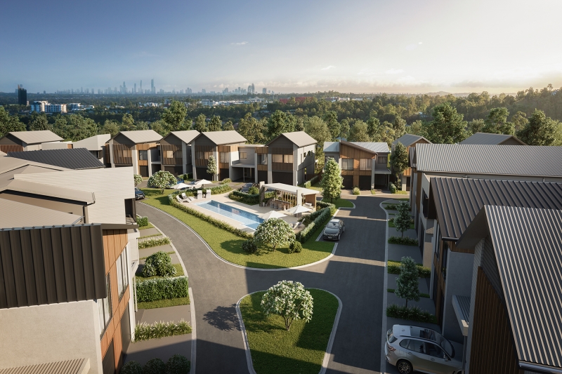 The inspiration for the homes is both the natural context and coastal character of the Gold Coast. The homes have been designed to have a cohesive character where the look and form of the buildings work in concert to create a light and open modern look. The use of render, weatherboards, overhangs, eaves and natural materials are carefully considered to create interesting buildings that relate to the neighbourhood’s natural Coastal context. This unique site has two outlooks, the creek and the forest. The homes have been master planned so that no home looks into another home to create private outdoor yards and living areas. All of the homes have been designed to look into the creek or the forest and have been designed to permit cross ventilation permitting lovely sea breezes through the home. The creek and valley to the north and east results in sea breezes from this direction with natural protection from the Western aspect. Ample visitor car parking is provided (1 car for every 2 dwellings) throughout the project. These townhomes are designed to maximize natural light, they are spread along a new, private residential street that curves through the environment. Beautiful park connectivity to Wyangan Creek through meandering walking trails throughout the estate.