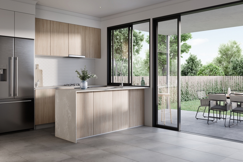 * Gourmet kitchen with functional design and reconstituted stone bench tops